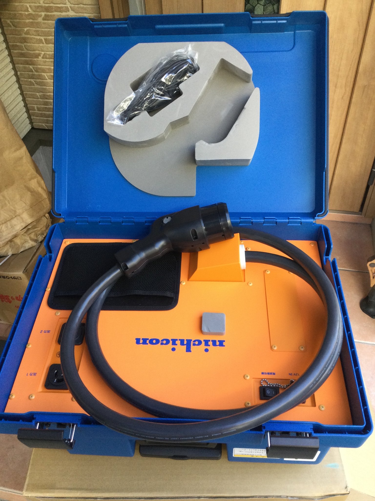 ⚫︎12Vポータブル電源から起動 ⚫︎15m延長ケーブルと分岐コードも本体に収納できました。 ⚫︎車載はリーフの運転席後ろにぴったり積載 |